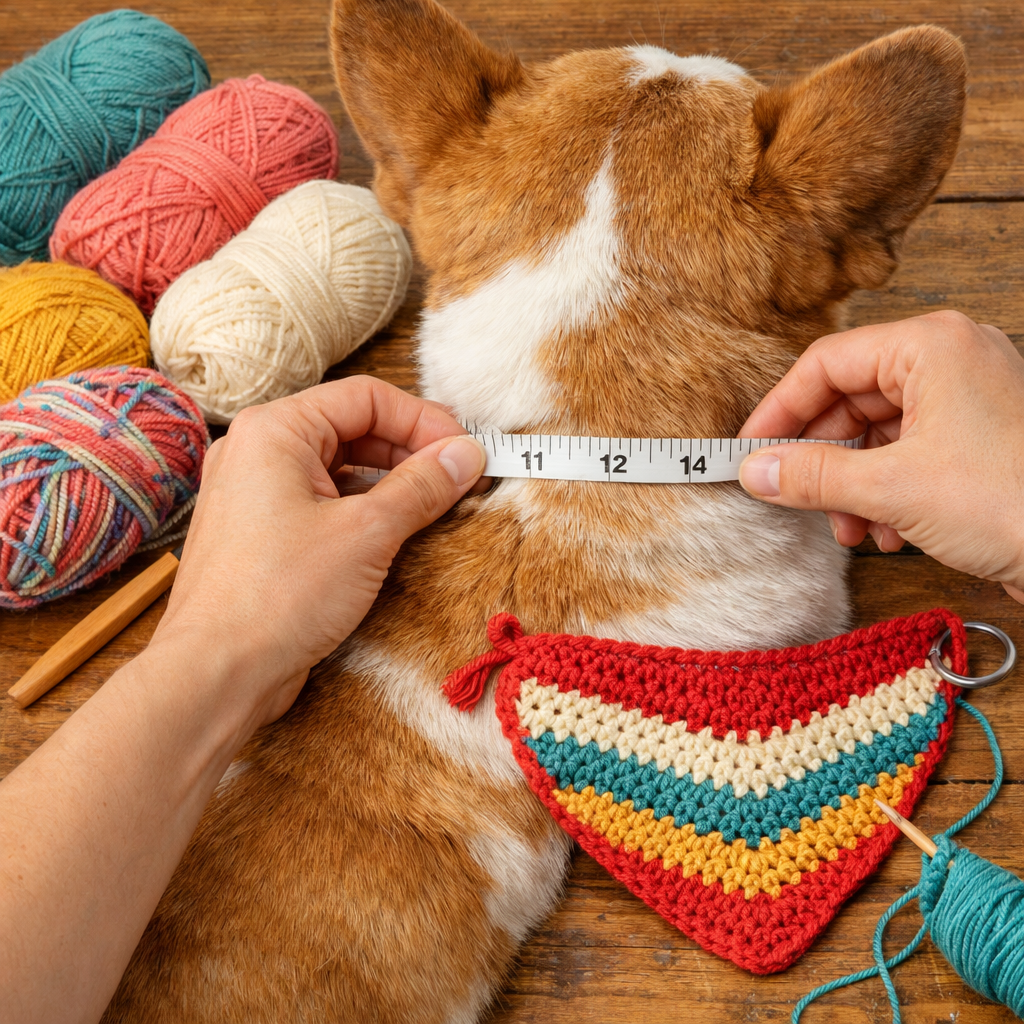 They should measure the dog’s neck before starting any dog bandana crochet pattern. Use a soft tape and measure where the collar sits. Add 1–2 inches for comfort and movement.